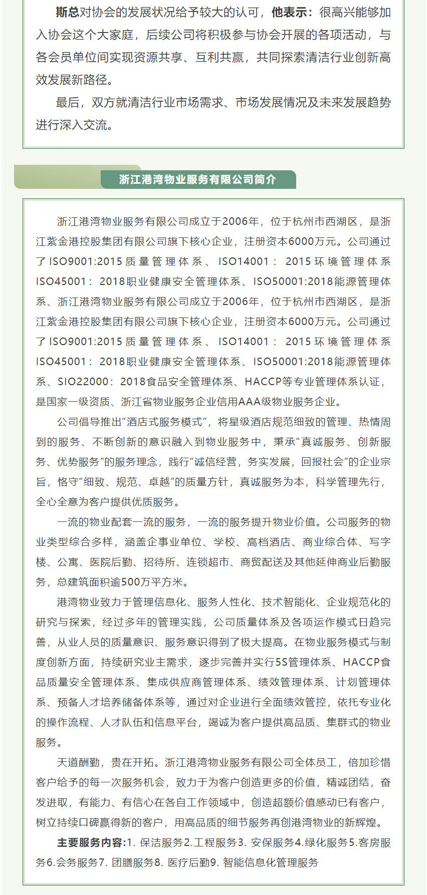 浙江省清洗保洁行业协会一行赴浙江港湾物业服务有限公司走访交流