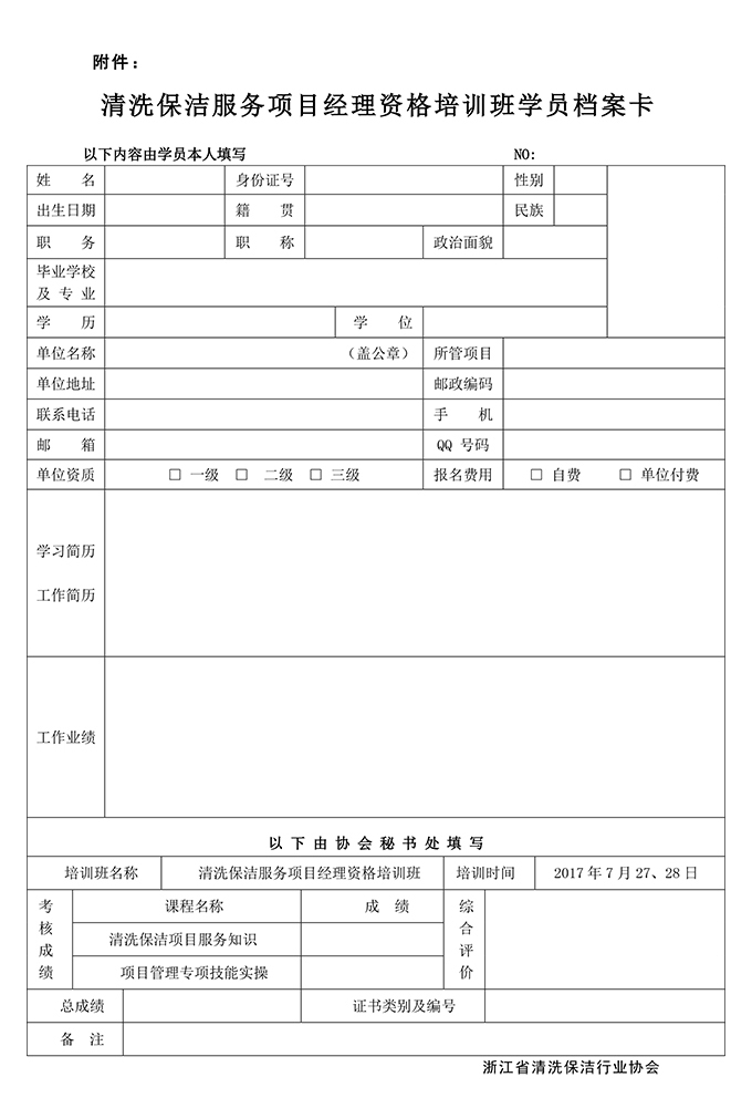 附件:清洗保洁服务项目经理资格培训班学员档案卡.docx