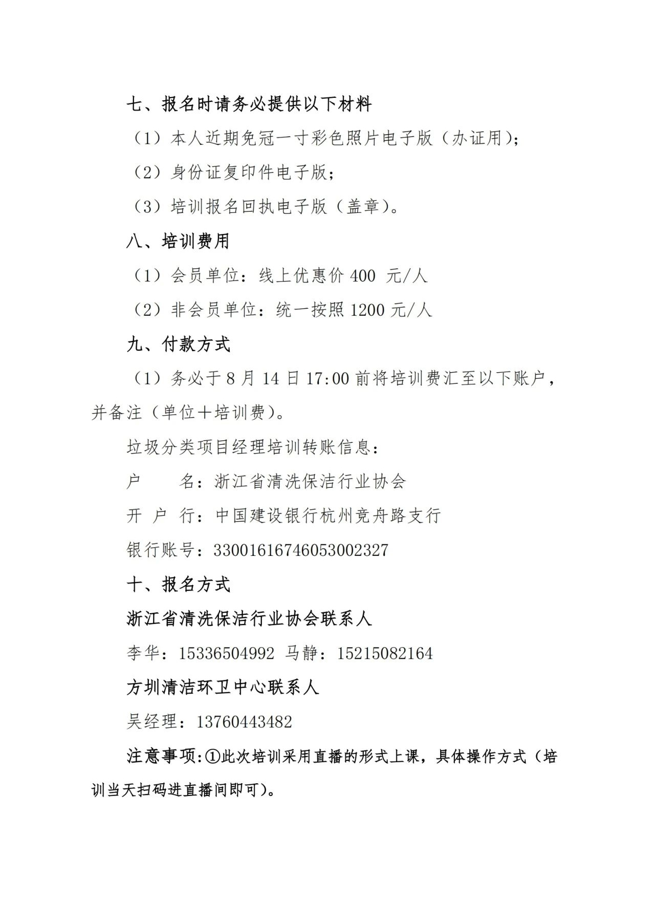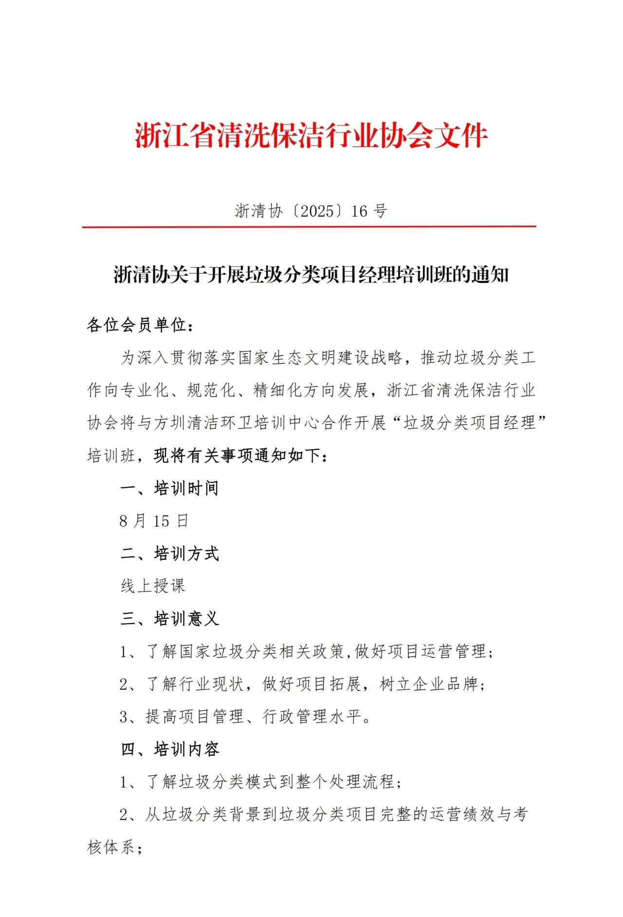 为深入贯彻落实国家生态文明建设战略,推动垃圾分类工作向专业化、规范化、精细化方向发展,浙江省清洗保洁行业协会将与方圳清洁环卫培训中心合作开展“垃圾分类项目经理”培训班,现将有关事项通知如下: